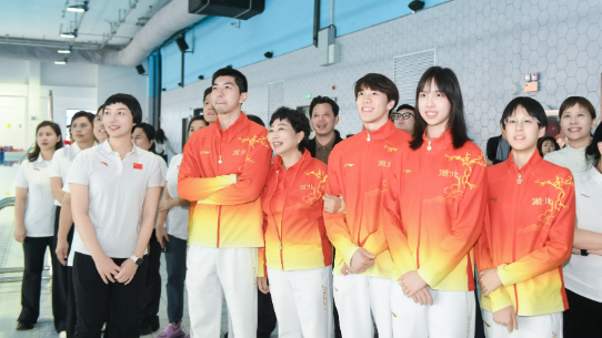 欢迎仪式上,温情与敬意交织,闫子贝、孙佳俊、彭旭玮、黄梓淳、柯雯曦等运动员首先走向各自输送教练,献上饱含感恩的鲜花。冠军们沿冠军大道步行至C2游泳馆,沿途驻足观看冠军墙,每一张照片、每一段荣誉都承载着他们与家乡体育的深厚联结,“回家”的温馨氛围扑面而来。